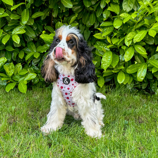 This pink strawberry dog harness is perfect for your new puppy, or a smaller dog such as a cocker spaniel that fits into an extra small (xs), or small (s) sized harness. Reference photos feature our cocker spaniel puppy Blue. He was 10 months old when photographed, and was wearing a small sized pink harness.